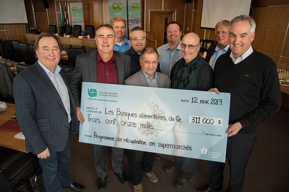 L’Union des producteurs agricoles (UPA) et certains de ses groupes affiliés se sont engagés à remettre 311 000 $ au Programme de récupération en supermarchés (PRS) de Banques alimentaires du Québec (BAQ) au cours des cinq prochaines années. Ce programme permet de récupérer les aliments invendus en épiceries et de les acheminer vers les personnes vivant de l’insécurité alimentaire.